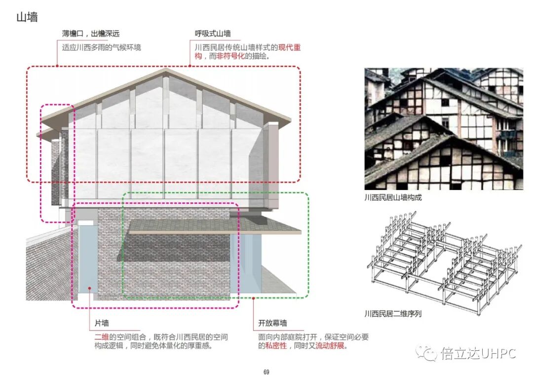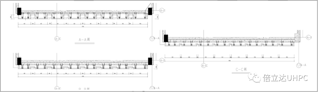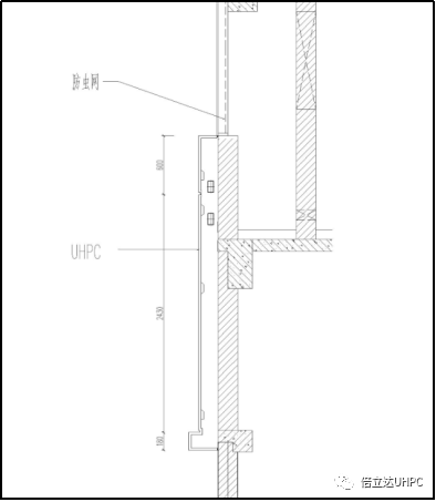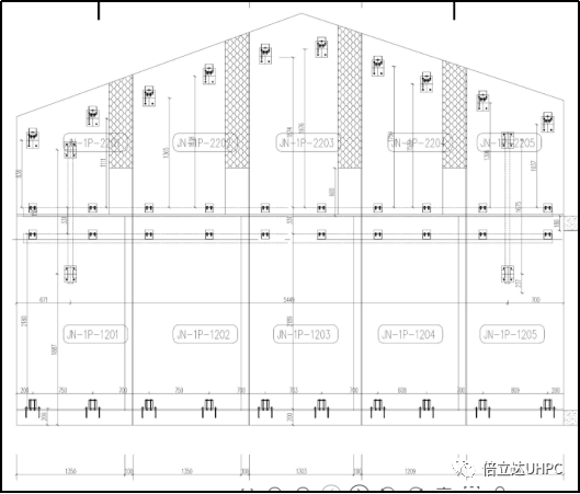 本工程1-5号楼山墙部位2层及2层以上采用UHPC高性能混凝土挂板,每块挂板尺寸为:长度2500mm - 7600mm,宽度1050mm - 1300mm;挂板厚度为30mm,加强肋处厚度为100mm;每个山墙位置挂板数量为6-10块,总面积约2400㎡。