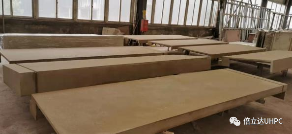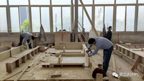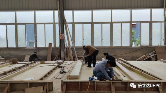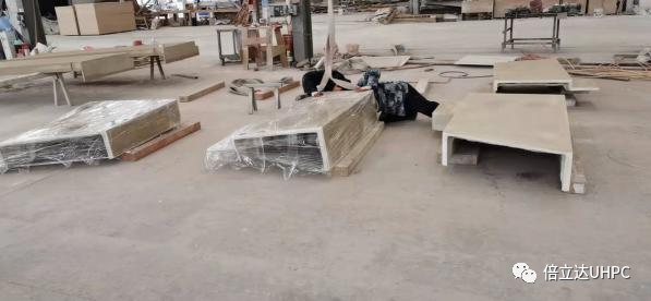 在初期技术准备方面,经过论证及生产检验,对UHPC生产配方及工艺进行优化,并对产品易产生集中应力的部进行加强,避免产品在脱模、运输、安装等移动环节产生裂缝。在原材料阶段,精细工艺实施,保证细骨料的合格率;在生产组织及计划管理方面,严格按照现场安装顺序组织模具、采用了木模具、雕刻模具等,做到保证质量满足工期下成本最优。