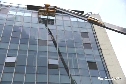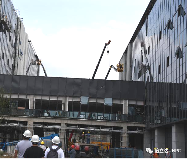▲内庭部位的施工难点:1200平方米的清水板,应用在高度22米的外墙,因场地受限,板子全靠人工运进去,然后靠电葫芦提升高度后进行安装。